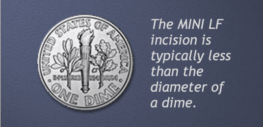 A series of tubes gently expands the surgical opening. The MINI LF incision is typically less then the diameter of a dime.Surgeons monitor the sizing, positioning and correct placement of the spacer using real-time fluoroscopy or with an intraoperative 3-D scan. Like our other MINI procedures, the MINI LF typically results in very little blood loss, much lower infection rates and quicker recoveries.